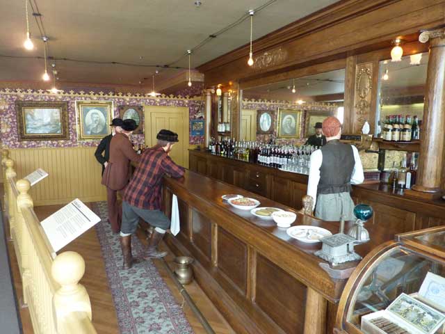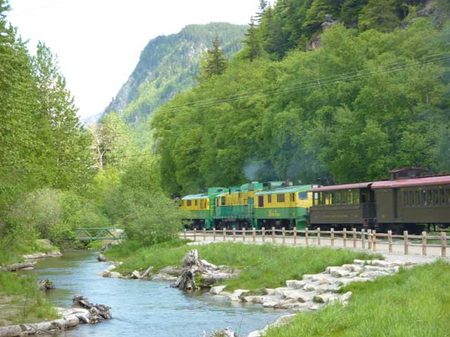 By embracing its gold-rush past, Skagway has managed to preserve a frontier spirit complete with saloons and dance-halls, though we managed to resist both. One building was covered in antlers but we couldn't work out why - attractive and unusual though it was. We couldn't resist a visit to the Wells Fargo Bank, though, as in spite of being a modern, working bank behind the counter, the main banking hall has been kept as it was in the Gold Rush days, with many of the original artefacts including the original safe, on display. The major attraction of this town, however, is the White Pass & Yukon Railway and a ride on it was a popular trip for many of our fellow passengers. We just looked at the train and also the ice-tunnel borer locomotive which used to be called in to make a way through the winter snow. The train could then travel every day, taking the prospectors to and from their claims.
