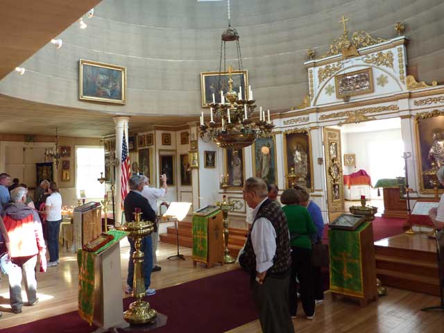 This was, to us, the port-of-call we most wanted to see having enjoyed Michael Chabon's novel, The Yiddish Policemen's Union and become interested in the history of the Russian outpost. (Sitka is, however, not at all like the fictional city in the novel.) A tranquil fishing village, Sitka was once part of the Russian Empire in the time of the Czars. The onion-domed Russian cathedral, much larger than the little chapel in Juneau, was the first place we visited and we were stunned by the quality and sheer quantity of fabulous icons on display.