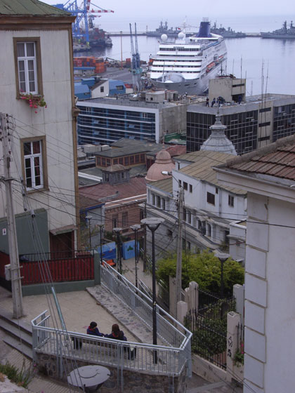 After a lazy afternoon at the hotel, The Sheraton, in the shadow of the snow-capped Andes, we enjoyed a splendid, typically Chilean dinner of various spit-roasted and barbecued meats (some unrecognisable and the provenance of which was probably best not enquired after too closely!) with lovely salads, desserts and fresh fruit to follow, all washed down with a delicious, local, purple-red Cabernet Sauvignon - Yum. An early night meant we were refreshed and ready for the following day when we enjoyed a morning walk along the river into town and then back to the hotel to be picked up by our chauffeur-driven limousine to be taken to the ship, the Norwegian Dream, at Valparaiso. And here the fun began …