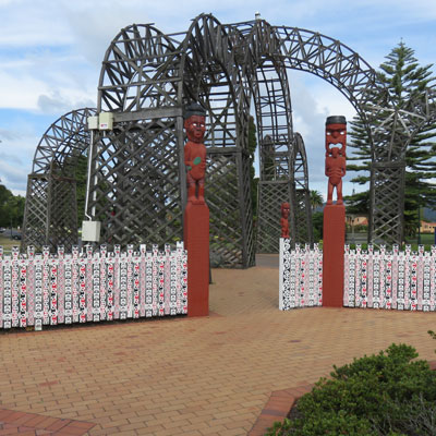 Gisborne is a very busy port, mainly catering for the logging industry and the constant stream of logging trucks arriving fully laden and leaving empty, ensure that it kept going day and night. There was once a lively fishing industry here but we saw little evidence of it. The main city of the region and once a prosperous and bustling centre, Gisborne was, perhaps, the starkest example of the decline in fortunes over the past few, difficult years, particularly since Covid reared its ugly head. The main streets were certainly depressed, with the number of empty shops very noticeable. Of those which were still just holding their own, many looked far from prosperous; there were very few people out and about in the shopping streets so their demise was hardly surprising. Once-thriving restaurants and cafes had closed down, although we did find two excellent restaurants, recommended to us by our hosts, where we enjoyed good, imaginative food. They were full and turning away would-be diners, so we hope that is a sign things may be improving and that other establishments will re-open in due course. There is a long seafront pathway and drive which provided lovely views of the sadly well-named, Poverty Bay, and was well used by walkers, cyclists and joggers. There are three rivers, the Taruheru and the Waimata and the Turanganui River, into which the others feed and which runs through the town and empties into this Bay. The bridge over the Turanganui, at the entrance to Gisborne, gives a good a view of the town and its attractive palm trees.