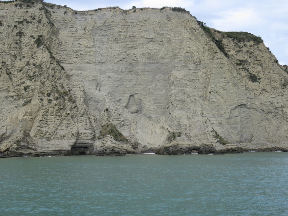 A short drive south brought us to Tolaga Bay, in a very rugged and remote location. The high, friable sandstone cliffs with numerous caves, form a dramatic boundary to the bay. There is another very long wharf; at 660m it is said to be one of the longest concrete wharves in the Southern Hemisphere. This, like the one at Tokomaru, was able to accommodate a full range of shipping, both passenger and cargo vessels. We enjoyed walking to the end of the wharf (or riding in my case), which gave us good close up views of the cliff face and the sweep of the Bay. There was good fishing off the end of the wharf and some lucky anglers caught some good sized snapper while we watched. It was a lovely sunny day but very windy, so we felt refreshed after too long in the car.