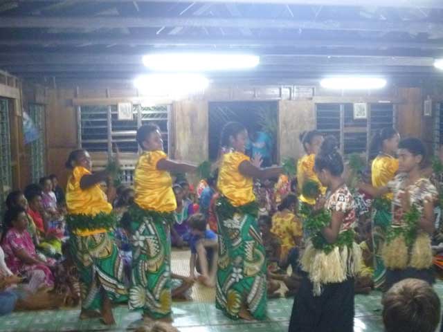 After dinner, which comprised chicken, fish, lamb and pork cooked in the oven-pit, wrapped in banana leaves, a pumpkin hollowed out and filled with onions and root vegetables (surprisingly tasty) and various fruits and salads, there was singing and dancing. Everyone from the tiniest tot to the oldest grandma gave their all to provide an exuberant and colourful show while some of the men-folk played various musical instruments to keep the dancers’ feet flying.