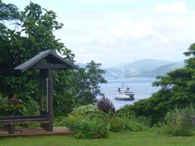 Boarding the ship at Denarau port was easy, assisted by ‘Captain Cook’, who must have been very hot in his full uniform, especially those long, wool socks! We had a nice surprise when we got on board to find that we'd been upgraded. We had booked the cheapest cabin (rabbit hutch) on the lowest deck, with just a porthole, but we were allocated a much bigger one on the top deck, with two windows! We didn't query it but it later transpired that the lower deck had been swamped in a particularly fierce cyclone which had hit the area around Christmas time and it's still being refurbished, so can't be used. We felt that it was compensation for that awful trip we had being chased by cyclones a couple of years ago!