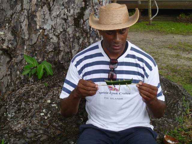 One of the crewmen from the ship cut down some coconut palm fronds and made a basket and also a very clever canoe with six paddles, which went back and forth when you move the base poles. You can see him, and the canoe, in this picture. He also demonstrated opening coconuts and talked about how the tree is useful from the roots to the branches, not just the fruit. All the crew members seem to be skilled at different things: crafts, marine biology, singing, dancing, you-name-it and they really are the most delightful, helpful and kind hearted people. The Reef Endeavour’s crew was totally Fijian excepting the cruise director who was German but had lived in Fiji for 10 years.