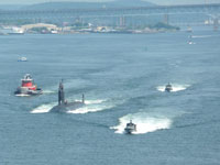 After that bit of excitement, there was more when a submarine, with several escort vessels sailed out towards us and passed us by very close on the port side. The crew were standing on the top of it around the conning tower and although we all waved they maintained their dignity. They gave us a blast of their horn as a salute so we gave them an even louder one lasting twice as long in return. We also passed some docked subs and a few in dry-dock or other maintenance facilities. Someone thought the Coast Guard had come aboard to make sure we didn't take photos but that wasn't the case at all and we snapped away like mad.